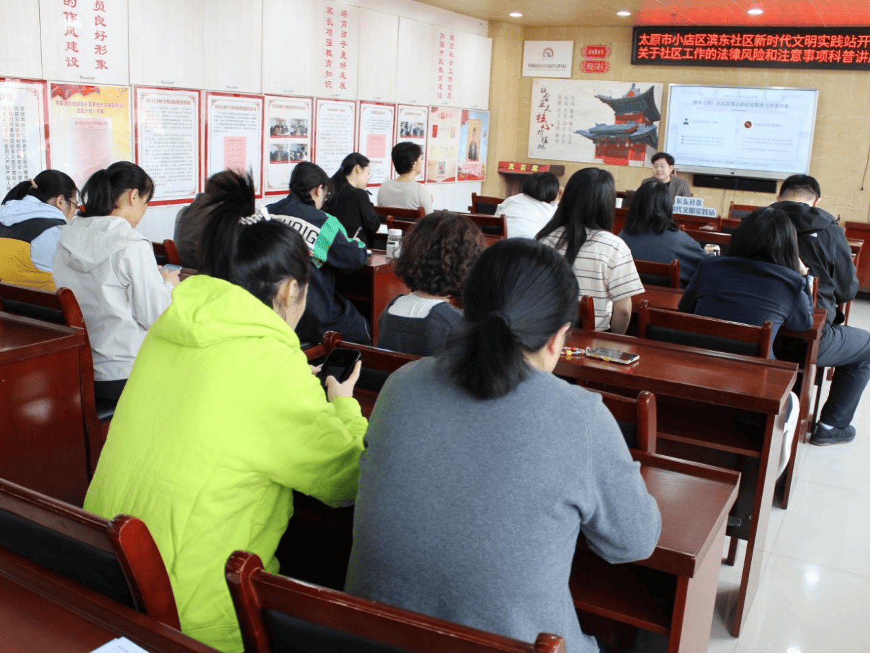2026 年4月2日,太原市小店区平阳路街道滨东社区新时代文明实践站内气氛热烈,一场以“社区工作的法律风险与注意事项”为主题的专题讲座在此开展。活动特邀京师(太原)律师事务所专职律师、社区法律顾问——任政豪律师主讲,吸引了全体社区工作人员积极参与。