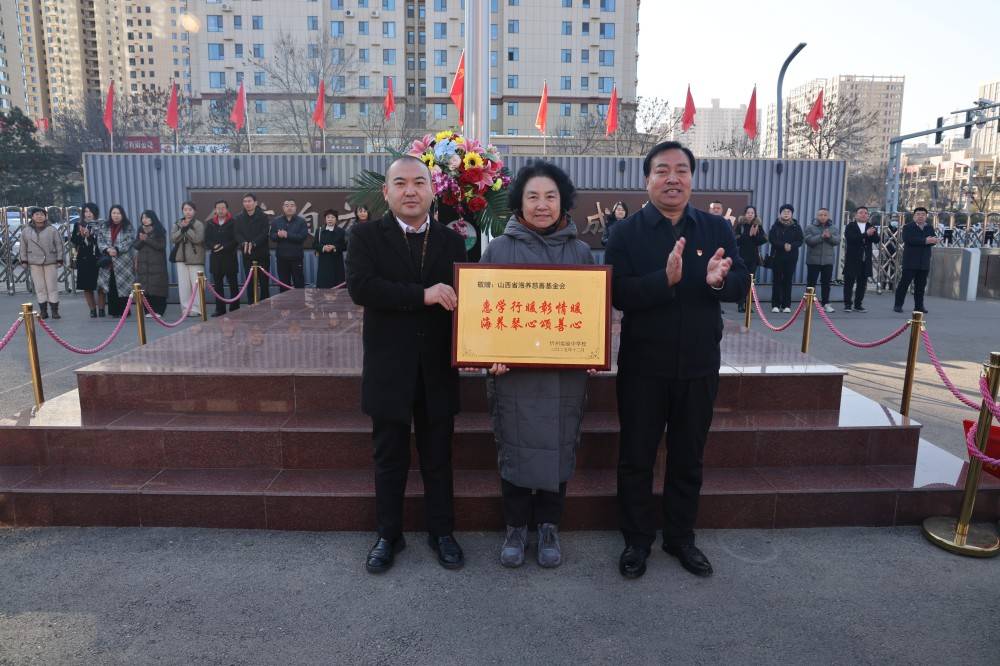 在温馨的仪式中,学校代表将饱含谢意的纪念牌匾郑重赠予山西省海养慈善基金会,由基金会执行会长刘召亮先生与党支部书记王素娟女士代为接收,这方牌匾,不仅承载着全校师生的由衷感激,更见证了公益力量与教育热土的一次美好共鸣。
